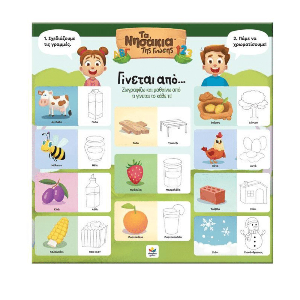 Από τι γίνεται το μέλι; Από πού βγαίνει το λάδι; Τι άλλο μπορώ να φτιάξω με το ίδιο υλικό; Ένωσε τις εικόνες μεταξύ τους και μάθε από τι παράγονται τα προϊόντα που χρησιμοποιούμε καθημερινά! Περιέχει και εκπαιδευτική χειροτεχνία, με την οποία τα παιδιά ζωγραφίζοντας μαθαίνουν τα αντικείμενα του παιχνιδιού!