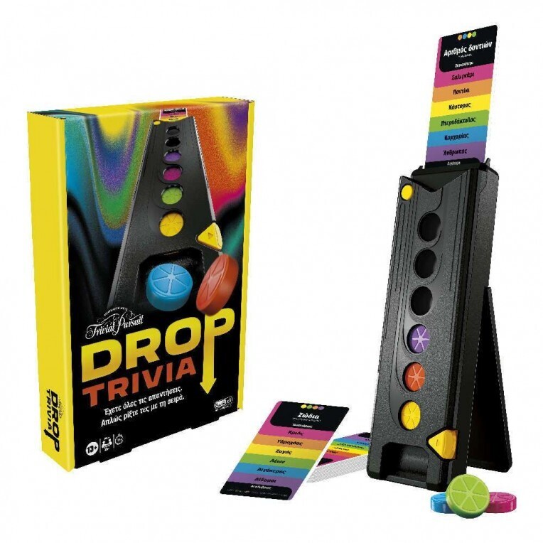 Ήρθε το ανανεωμένο DROP TRIVIA! Το αγαπημένο παιχνίδι ερωτήσεων τώρα πιο ανταγωνιστικό και διασκεδαστικό από ποτέ! Παίξτε σε ομάδες ή και μόνοι σας, με αντίπαλο τον χρόνο. Απάντησε σωστά στις ερωτήσεις, βάλε τις απαντήσεις στη σειρά με τα σωστά χρώματα πριν τελειώσει ο χρόνος σου! Πρόσεξε μην δώσεις το προβάδισμα στην αντίπαλη ομάδα, αν δεν απαντήσεις σωστά! Σε αυτήν την πρωτοποριακή έκδοση το TRIVIA περιλαμβάνει ανανεωμένες ερωτήσεις γνώσεων που θα σε ρίξουν αν δεν απαντήσεις σωστά!