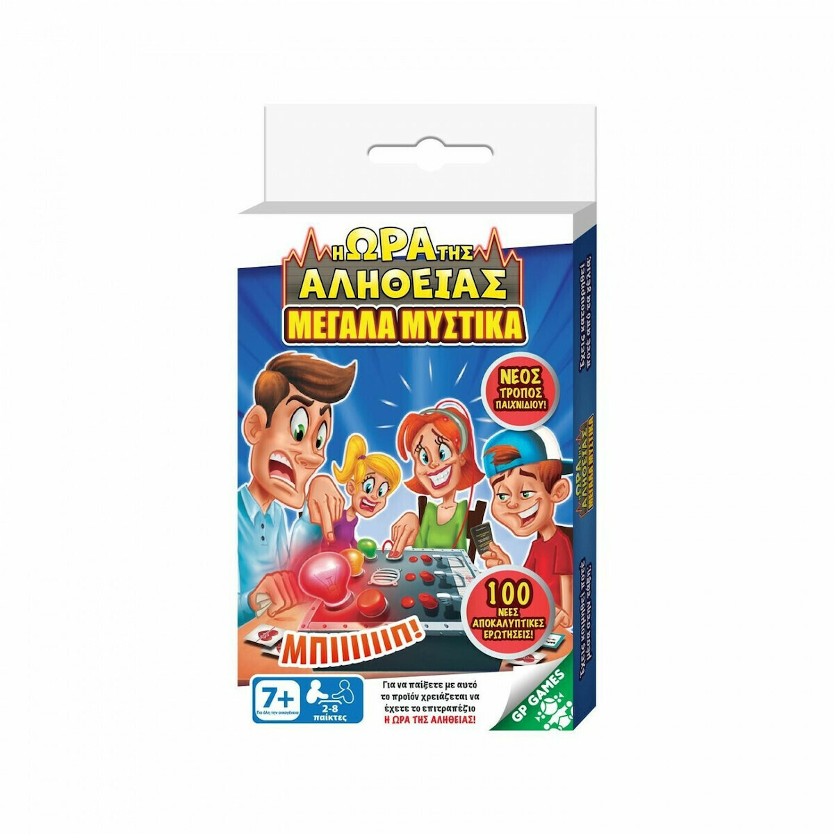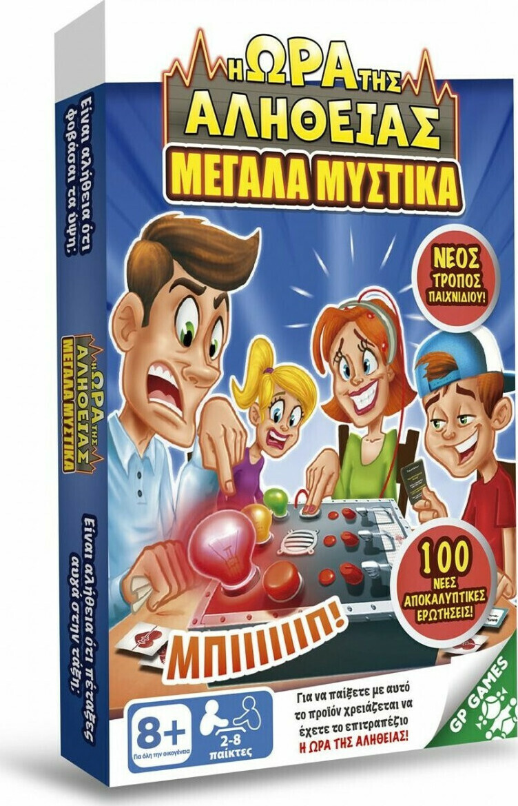 Αλήθεια ή Ψέμα;Ένα παιχνίδι που έρχεται να κάνει το επιτραπέζιο Η Ώρα της Αλήθειας (πωλείται ξεχωριστά) ακόμα πιο διασκεδαστικό!Στο σετ με κάρτες Η Ώρα της Αληθειας-Μεγάλα Μυστικά, θα βρείτε 100 νέες ερωτήσεις σε 50 κάρτες για να ανακαλύψετε τα πιο απίθανα μυστικά καθώς και 14 κάρτες δράσης.Χρησιμοποιήστε τις κάρτες δράσης για να πειράξετε τους άλλους παίκτες ή για να επωφεληθείτε κατά τη διάρκεια του παιχνιδιού με το επιτραπέζιο, Η Ώρα της Αλήθειας!Σημείωση: Το σετ με τις κάρτες δεν αποτελεί ξεχωριστό παιχνίδι. Είναι επέκταση του επιτραπεζίου Η Ώρα της Αλήθειας που πωλείται ξεχωριστά.