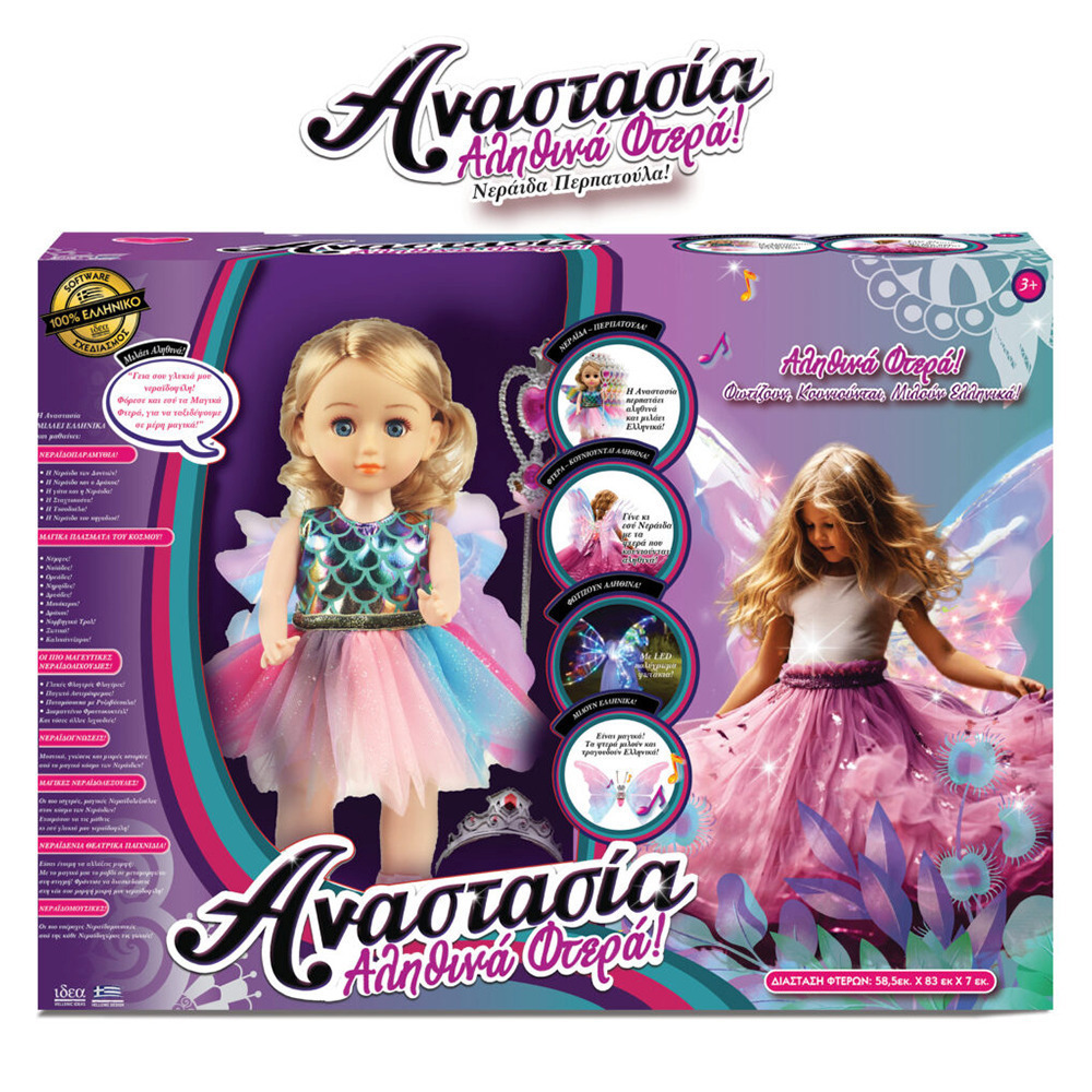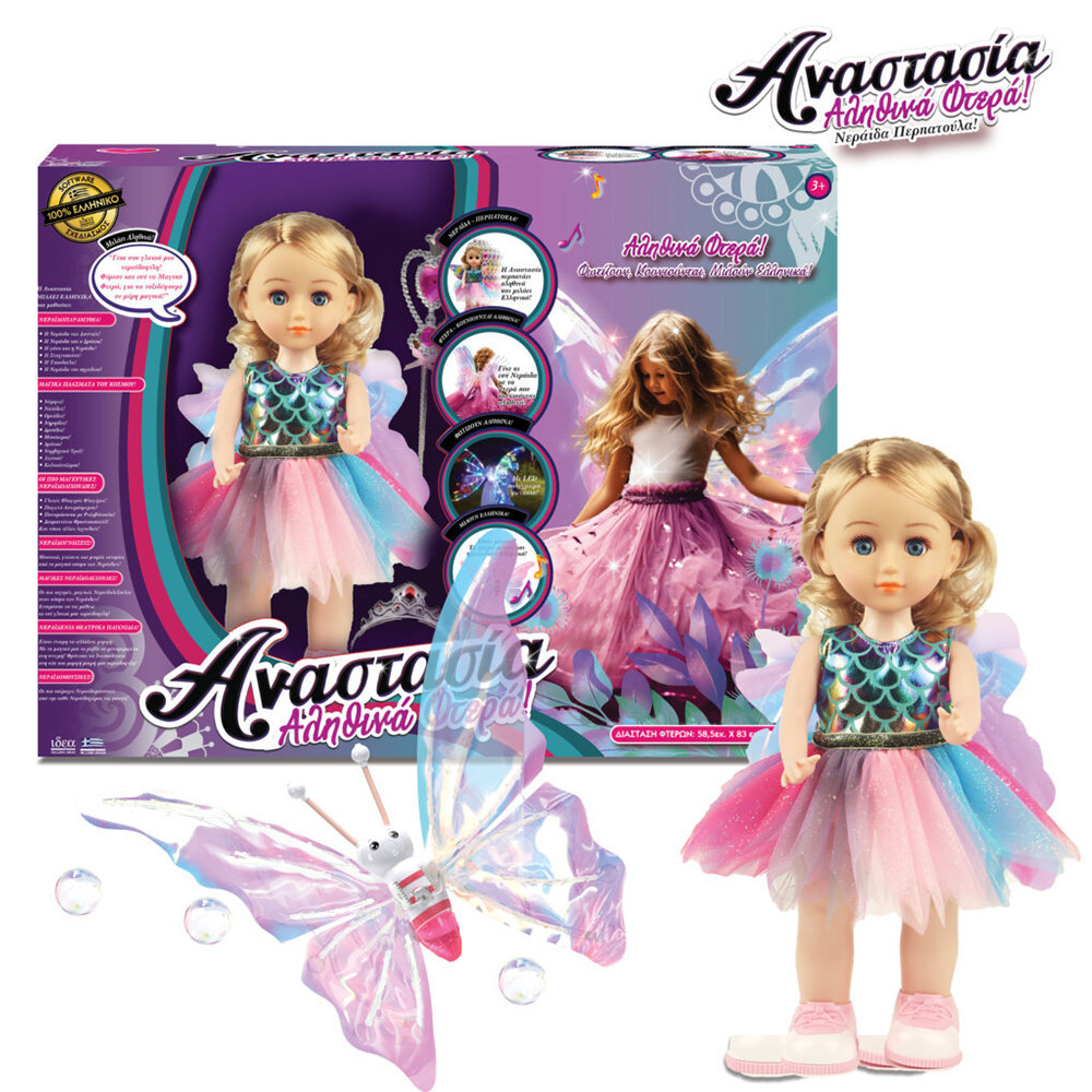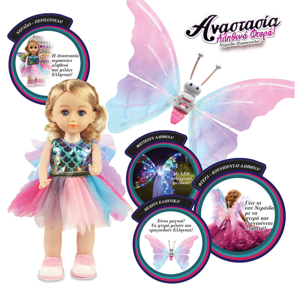 Η Αναστασία είναι κούκλα Νεράιδα, περπατάει αληθινά, μιλάει ελληνικά και λειτουργεί διαδραστικά με τα παιδιά, σαν αληθινή φίλη. Περιλαμβάνει αληθινά φτερά για τα παιδιά (με λουράκια για προσαρμογή στην πλάτη), που κουνιούνται, φωτίζονται με πολύχρωμα led, μιλούν ελληνικά και παίζουν νεραϊδένιες μουσικές! (Τα φτερά συναρμολογημένα έχουν διάσταση 83x59x7cm). Ένα ολοκληρωμένο σετ παιχνιδιού που θα μεταφέρει τις μικρές μας νεραϊδούλες στο μαγικό κόσμο του παραμυθιού! Η κούκλα ΑΝΑΣΤΑΣΙΑ μιλάει & μαθαίνει: -Νεραϊδοπαραμύθια! • H Νεράιδα των Δοντιών!• Η Νεράιδα και ο Δράκος!• Η γάτα και η Νεράιδα!• Η Σταχτοπούτα!• Η Τοσοδούλα!• Η Νεράιδα του πηγαδιού! Ιστορίες για τα μαγικά πλάσματα του κόσμου! Νύμφες, Ναϊάδες, Ορεάδες, Νηρηίδες, Δρυάδες, Μονόκεροι, Δράκοι, Νορβηγικά Τρολ, Ξωτικά, Καλικάντζαροι! -Μαγευτικές νεραϊδολιχουδιές! Γλυκές Φλογερές Φλογέρες, Παγωτό Αστερόκρεμας, Ποταμόσουπα με Ρυζοβότσαλα, Διαμαντένιο Φρουτοκοκτέιλ, Και τόσες άλλες λιχουδιές! -Νεραϊδογνώσεις! Μυστικά, γνώσεις και μικρές ιστορίες από το μαγικό κόσμο των Νεράιδων! -Μαγικές νεραϊδολεξούλες! Οι πιο ισχυρές, μαγικές Νεραϊδολεξούλες στον κόσμο των Νεράιδων! Νεραίδένια θεατρικα παιχνίδια! -Νεραϊδομουσικές! Τα αληθινά φτερά μιλούν ελληνικά & μαθαίνουν: -θεατρικά νεραϊδοπαραμύθια! Λειτουργεί με 3 μπαταρίες τύπου ΑΑ για την κούκλα (δεν περιέχονται) και 3 μπαταρίες τύπου ΑΑ για τα φτερά (περιέχονται).