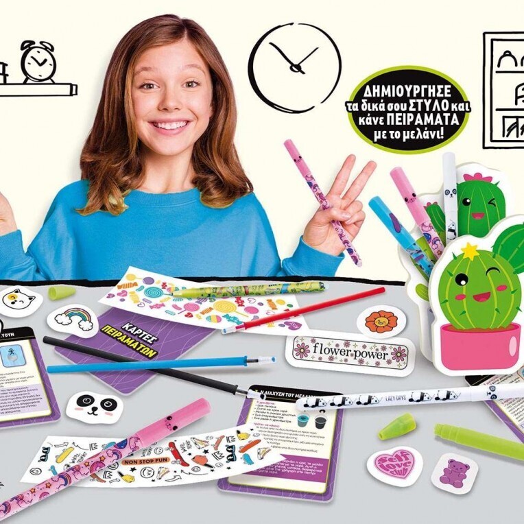 Περιεχόμενα: Στυλό, Καπάκια, Μύτες, Ανταλλακτικά μελανιού που σβήνει, Κάρτες πειραμάτων, Γόμες σιλικόνης, Θήκες στυλό για συναρμολόγηση, Αυτοκόλλητα, Μαρκαδόρος που σβήνει, Εικονογραφημένο βιβλίο οδηγιών
