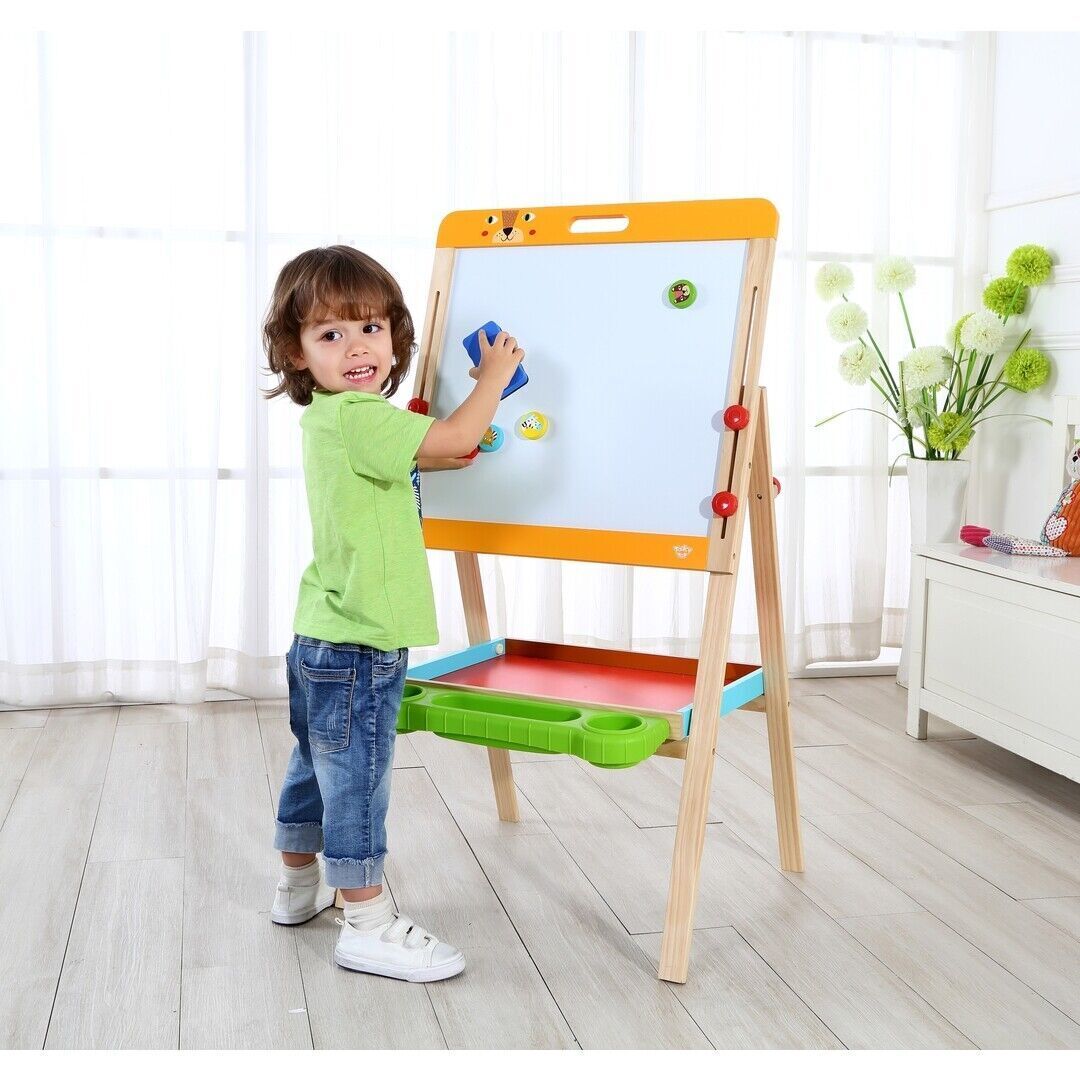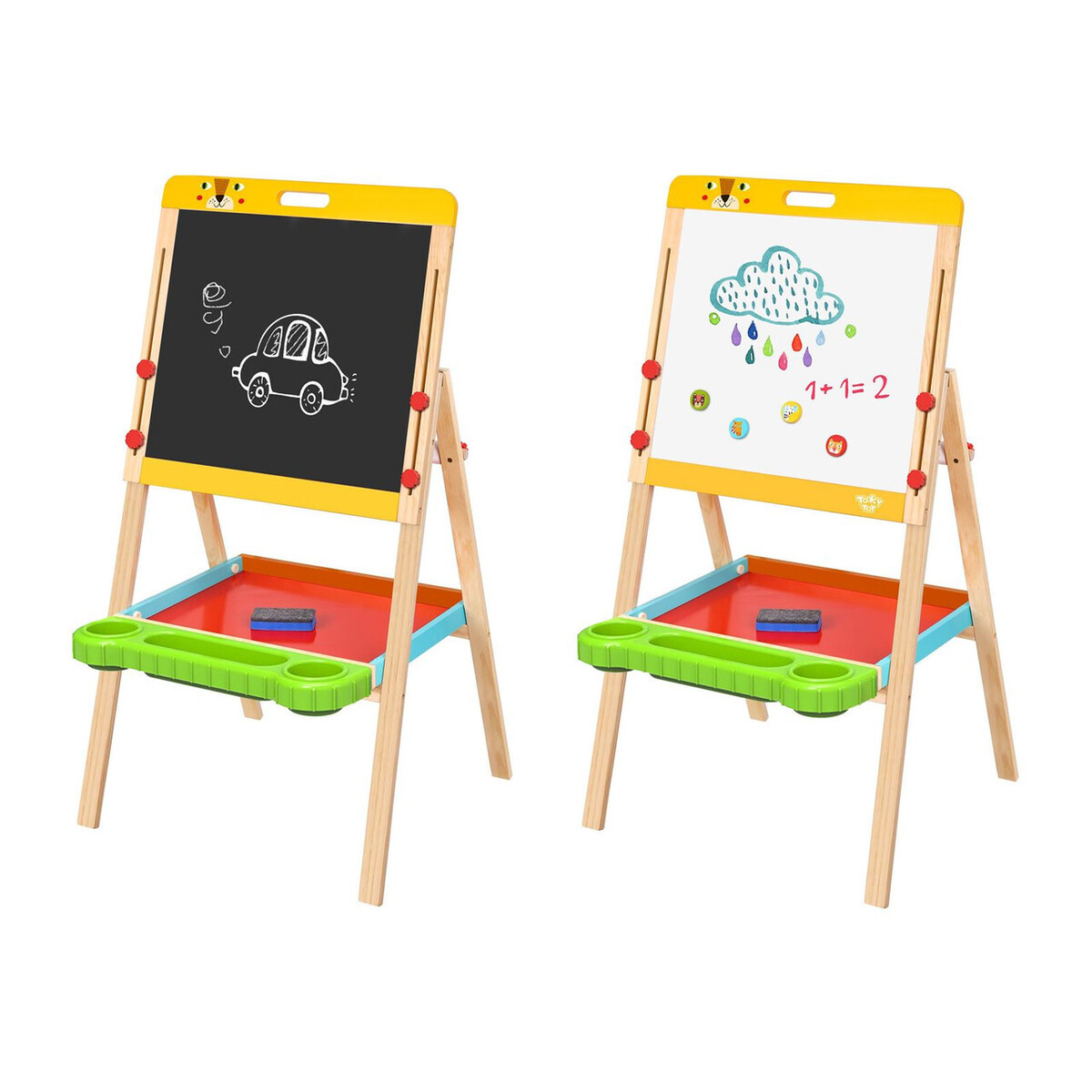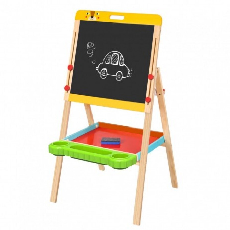 Ένα ξύλινο καβαλέτο δύο όψεων που προσφέρει αμέτρητες δυνατότητες δημιουργικής απασχόλησης και εκμάθησης μέσω παιχνιδιού. Βοηθάει στην ανάπτυξη της φαντασίας και των κινητικών δεξιοτήτων του παιδιού και ιδιαίτερα στο συντονισμό χεριού και ματιού. Με 4 χρωματιστά μαγνητάκια για τη σταθεροποίηση του χαρτιού ζωγραφικής και σφουγγάρι.