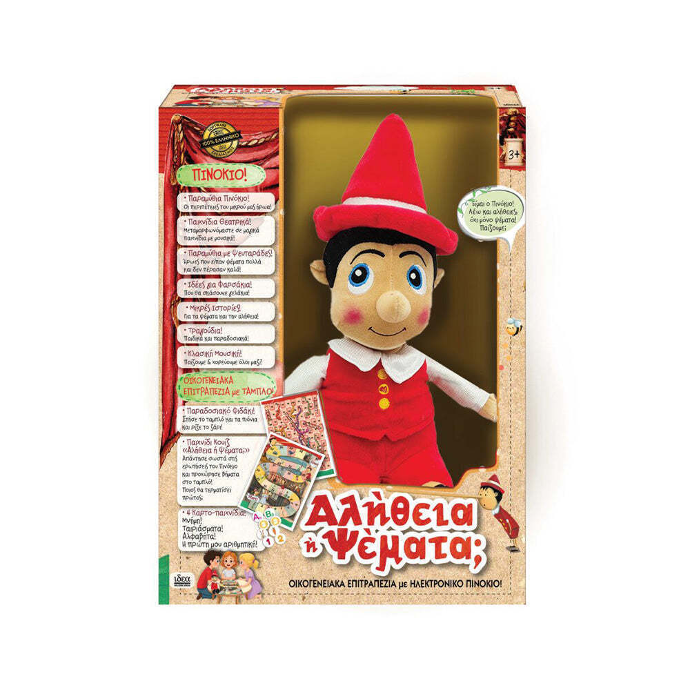 Το εκπαιδευτικό παιχνίδι Πινόκιο Αλήθεια ή Ψέματα είναι μια ηλεκτρονική κούκλα που μιλάει ελληνικά. Διαθέτει πολλές δραστηριότητες που ενθουσιάζουν τα παιδιά: