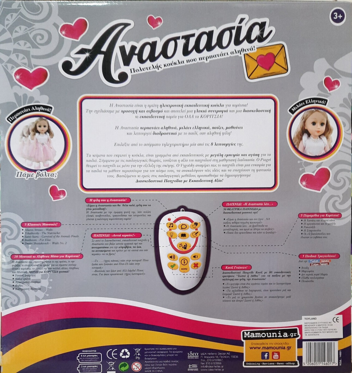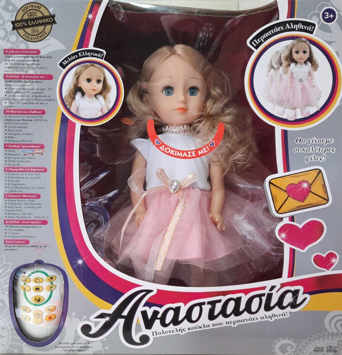 Η Αναστασία είναι η πρώτη μηχανική εκπαιδευτική κούκλα των κοριτσιών!Περπατάει αληθινά, μιλάει ελληνικά, παίζει, μαθαίνει και λειτουργεί διαδραστικά με το παιδί, σαν αληθινή φίλη.Επιλέξτε από το ασύρματο τηλεχειριστήριο μία από τις 8 λειτουργίες της: