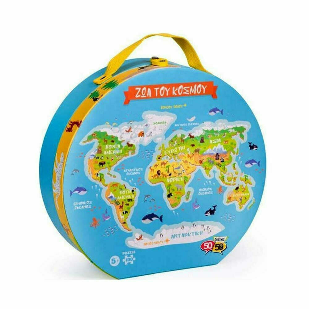Ένα πρωτότυπο παζλ χάρτης που απεικονίζει τα ζώα ολόκληρου του κόσμου. Από τη Βόρεια Αμερική μέχρι την παγωμένη Ανταρκτική θα δεις και θα γνωρίζεις τα ζώα που κατοικούν στα πέρατα της γης συναρμολογώντας αυτό το παζλ 100 κομματιών της σειράς «50/50 GAMES».
