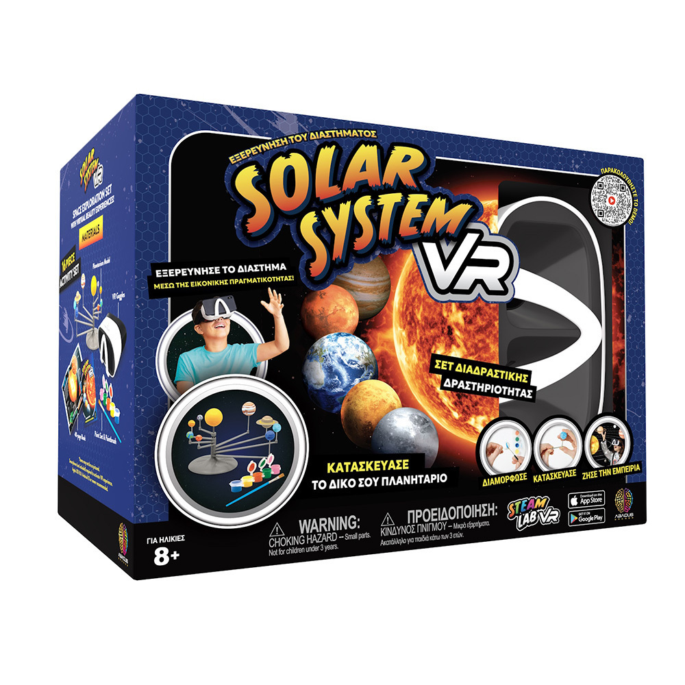 Έτοιμος για απογείωση; Φόρεσε τα VR γυαλιά σου και ταξίδεψε στο διάστημα, εξερευνώντας τους πλανήτες, τους δορυφόρους και τα άστρα που σχηματίζουν το εντυπωσιακό ηλιακό μας σύστημα! Με το Solar System VR της Abacus Brands, η εκμάθηση γίνεται μια διαστημική περιπέτεια, γεμάτη γνώσεις, παιχνίδι και επαυξημένη πραγματικότητα!