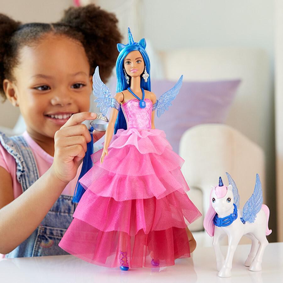 Γιορτάστε την 65η επέτειο της Barbie με αυτήν την εντυπωσιακή κούκλα! Εμπνευσμένη από τον χαρακτήρα στη σειρά Barbie Μία Δόση Μαγείας, αυτή η παραμυθένια κούκλα-μονόκερος είναι εντυπωσιακή με ένα ροζ όμπρε φόρεμα με βολάν. Τα μπλε μαλλιά της διακοσμούνται με στέκα μονόκερου, ενώ οι μανσέτες-φτερά και η αφαιρούμενη ουρά προσθέτουν μια επιπλέον παραμυθένια νότα. Τα ασημί σκουλαρίκια της, τα ψηλοτάκουνα, η βούρτσα και ο μονόκερος φίλος της, ολοκληρώνουν την παρουσία της! Η κούκλα δεν μπορεί να σταθεί όρθια μόνη της.