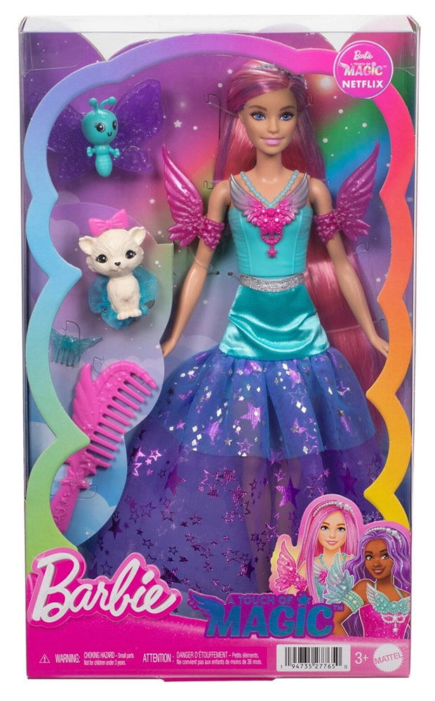 Αυτή η κούκλα Barbie μόνο μαγική μπορεί να χαρακτηριστεί με τα μακριά φανταστικά μαλλιά της και το αστραφτερό φόρεμά της! Έχει μωβ μαλλιά μήκους 17,78 εκατοστών και περιλαμβάνει αξεσουάρ όπως χτένα, αστραφτερή κορδέλα και διακοσμητική καρφίτσα μαλλιών. Η κούκλα Barbie 'Malibu' Roberts φοράει ένα αστραφτερό ντύσιμο εμπνευσμένο από την εμφάνισή της στο Barbie A Touch of Magic. Δύο κατοικίδια και αξεσουάρ styling προσθέτουν στη φανταστική διασκέδαση! Έρχεται με μια αξιολάτρευτη φίλη πεταλούδα, καθώς και ένα κατοικίδιο κουτάβι που φοράει ένα σούπερ χαριτωμένο tutu. Η κούκλα δεν μπορεί να σταθεί μόνη της. Τα χρώματα και τα διακοσμητικά μπορεί να διαφέρουν.