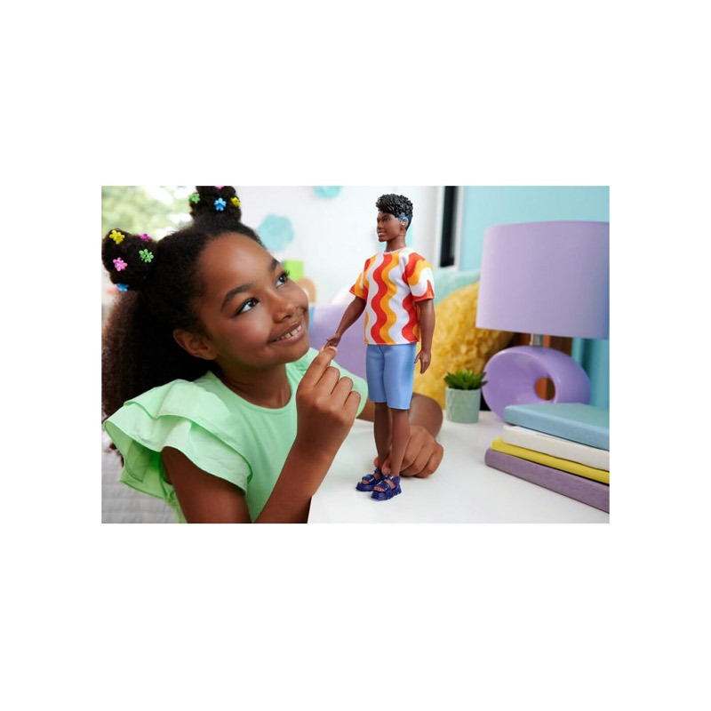 Οι Barbie® και Ken® Fashionistas™ γιορτάζουν τη διαφορετικότητα με κούκλες μόδας που ενθαρρύνουν την αφήγηση στον πραγματικό κόσμο και τα όνειρα ανοιχτού τέλους! Με μεγάλη ποικιλία αποχρώσεων δέρματος, χρωμάτων ματιών, χρωμάτων και υφών μαλλιών, σωματότυπου και μόδας, οι κούκλες έχουν σχεδιαστεί για να αντικατοπτρίζουν τον κόσμο που βλέπουν τα παιδιά σήμερα -- και τα ρούχα που τραβούν την προσοχή τους τις βοηθούν να ξεχωρίζουν με προσωπικότητες που αναδεικνύονται! Τα παιδιά μπορούν να συλλέξουν κούκλες Barbie® και αξεσουάρ για άπειρους τρόπους να παίζουν ιστορίες, να εκφράσουν το δικό τους στυλ και να ανακαλύψουν ότι η μόδα είναι διασκεδαστική για όλους! Ο Ken φορά ένα μοντέρνο ρούχο που αναδεικνύεται η ομορφιά του με ένα πορτοκαλί και κίτρινο σχέδιο στο πουκάμισό του και ένα μπλε σορτς. Είναι μεγαλόσωμος, έχει σπορ σμιλεμένα κοντά μαύρα μαλλιά και φοράει ακουστικά βαρηκοΐας. Τα μπλε gel πέδιλα του ολοκληρώνουν τη διασκεδαστική χαλαρή εμφάνιση του!