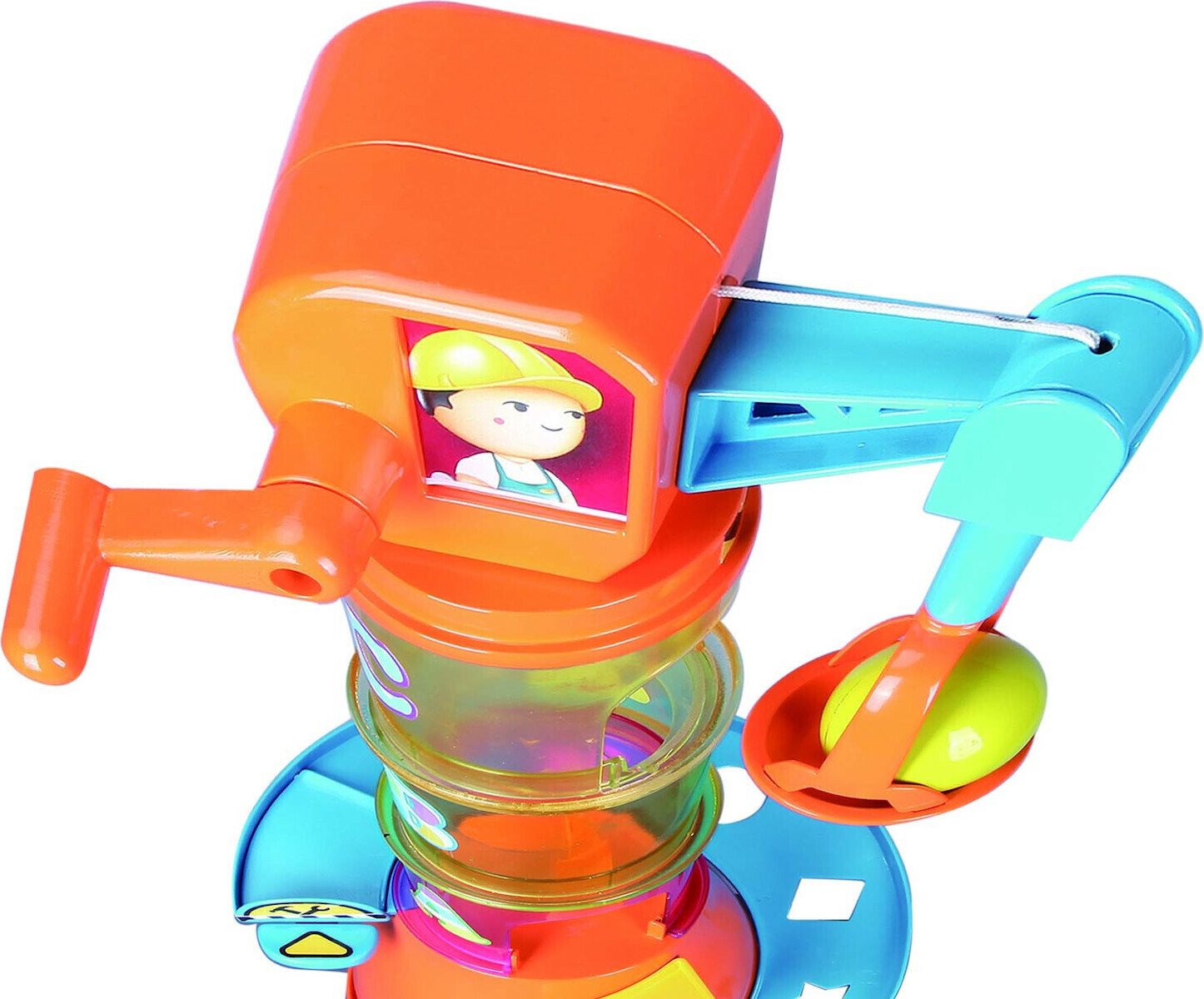 Απλά στοίβαξε τα τμήματα από το μεγαλύτερο στο μικρότερο και ο εργοδηγός της κατασκευής θα μπορεί να φορτώσει την μπάλα. Παρακολουθήσέ την να κυλά μέσα από τα ημιδιαφανή κομμάτια μέχρι να φορτωθεί στο ανατρεπόμενο φορτηγό!