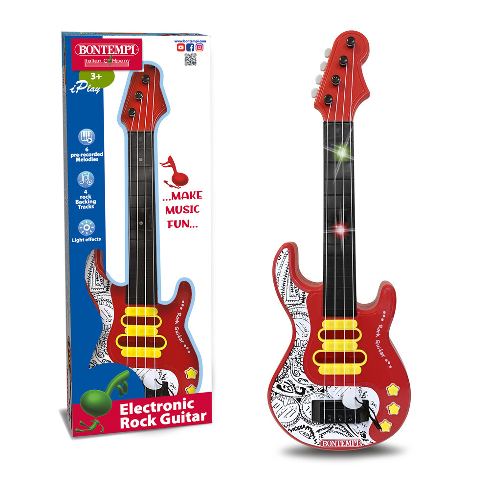 Ηλεκτρική Rock κιθάρα με φώτα ,με λουράκι ώμου, πένα, 6 προ-ηχογραφημένες μελωδίες, εφέ με φώτα, 4 rock κομμάτια, μουσικό διάλειμμα και αυτόματη απενεργοποίηση. Λειτουργεί με 3 μπαταρίες τύπου ΑΑ (δεν περιέχονται).
