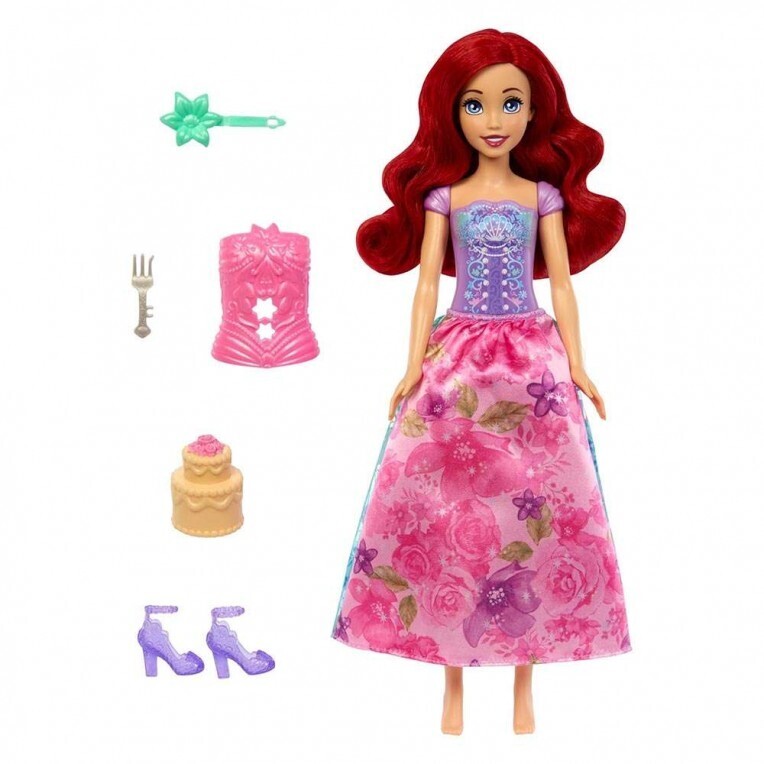 Ariel της Disney αποκτά μια μαγική ανατροπή σε αυτήν την εμπειρία unboxing του Disney Princess Spin & Reveal! Πρώτα ανοίξτε το λουλούδι για να αποκαλύψετε μια σκηνή παιχνιδιού με σιλουέτες μυστηρίου. Στη συνέχεια, γυρίστε το πακέτο για να βρείτε 5 μυστήριες τσάντες γεμάτες με 5 αξεσουάρ και 5 αυτοκόλλητα. Η τελική αποκάλυψη είναι μια κούκλα μόδας Ariel με ένα όμορφο φλοράλ ντύσιμο! Η αναστρέψιμη φούστα και το μπούστο που κουμπώνει επεκτείνουν τη διασκέδαση, ενώ τα παιδιά μπορούν να διακοσμήσουν τη σκηνή του παιχνιδιού και να φανταστούν ιστορίες με αυτό ως φόντο. Η κούκλα δεν μπορεί να σταθεί μόνη της.