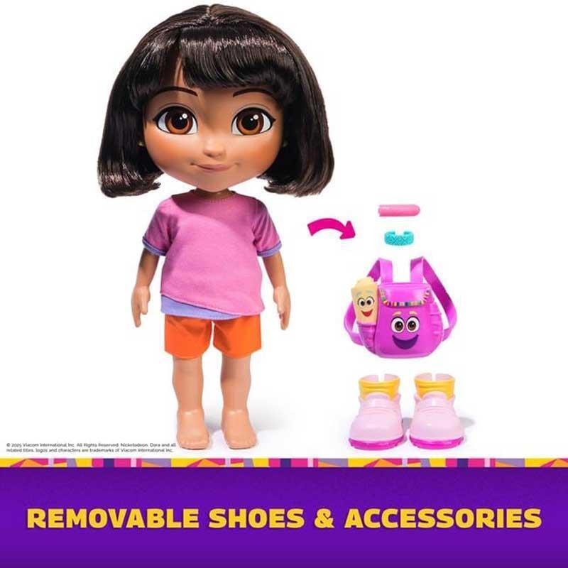 Η Dora η Μικρή Εξερευνήτρια γίνεται η καλύτερη φίλη των παιδιών με τη διαδραστική κούκλα ύψους 30,4 εκ. Με αφαιρούμενα παπούτσια και αξεσουάρ, τα παιδιά μπορούν να τη ντύνουν και να τη στολίζουν όπως θέλουν. Τα απαλά μαλλιά της είναι ιδανικά για χτένισμα, ενώ τα κινούμενα μέλη της επιτρέπουν να κάθεται ή να στέκεται, ακολουθώντας τα παιδιά σε κάθε περιπέτεια.