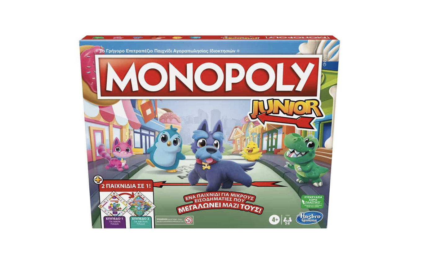 Η Monopoly Junior 2 σε 1 είναι το παιχνίδι που μεγαλώνει μαζί με το παιδί σας! Το ταμπλό διπλής όψεως προσφέρει 2 επίπεδα παιχνιδιού. ώστε οι οικογένειες να μπορούν να αποφασίσουν ποιο επίπεδο είναι καλύτερο για αυτές. Το παιχνίδι Επιπέδου 1. που προτείνεται για ηλικίες 4-5 ετών. βοηθά τα παιδιά να εξασκηθούν στην αντιστοίχιση και τη μέτρηση. καθώς μετρούν κενά. ταιριάζουν εικόνες και αγοράζουν ακίνητα. Ο παίκτης με τα περισσότερα ακίνητα κερδίζει! Είστε έτοιμοι να ανεβείτε ένα επίπεδο; Αναποδογυρίστε το ταμπλό για το πιο προηγμένο παιχνίδι Επιπέδου 2. που συνιστάται για ηλικίες 6 ετών και άνω. που εστιάζει στην ανάγνωση και στα απλά μαθηματικά. Οι παίκτες μπορούν να αγοράσουν ακίνητα. να εισπράξουν ενοίκια και να ανακαλύψουν την περιουσία τους! Για να κερδίσετε. πρέπει να γίνετε ο παίκτης με τα περισσότερα χρήματα. Το παιχνίδι σε κάθε επίπεδο χρησιμοποιεί το δικό του σύνολο χρημάτων και καρτών Monopoly. καθώς και τους δικούς του κανόνες. Και τα δύο παιχνίδια περιλαμβάνουν 6 χαριτωμένα πιόνια.