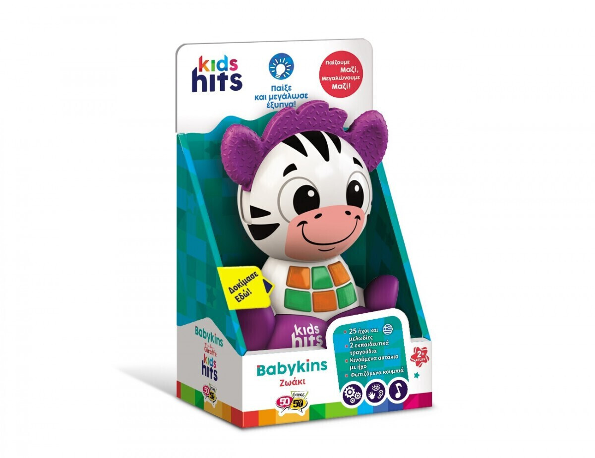 Το Babykins Ζωάκι Ζέβρα με τα χαρούμενα χρώματα και τους διασκεδαστικούς ήχους θα ενθουσιάσει κάθε παιδί! Τα ανάγλυφα αυτάκια του παιχνιδιού κινούνται κάνοντας κλικ. Πιέζοντας τα φωτεινά κουμπάκια, το παιδί επιλέγει να ακούσει τραγουδάκια στα Ελληνικά, χαρούμενες μελωδίες και αστείους ήχους. Τραγουδώντας την αλφάβητο και μαθαίνοντας αρίθμηση, κάθε μικρός φίλος θα διασκεδάσει αποκτώντας νέες γνώσεις! Διατίθεται σε τρία σχέδια: τάρανδος, καμηλοπάρδαλη και ζέβρα. Χαρακτηριστικά: