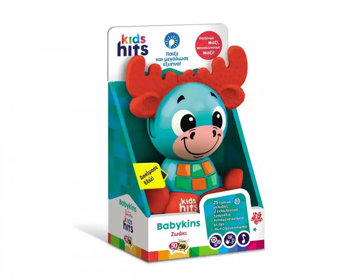 Το Babykins Ζωάκι Τάρανδος με τα χαρούμενα χρώματα και τους διασκεδαστικούς ήχους θα ενθουσιάσει κάθε παιδί! Τα ανάγλυφα κερατάκια του παιχνιδιού κινούνται κάνοντας κλικ. Πιέζοντας τα φωτεινά κουμπάκια, το παιδί επιλέγει να ακούσει τραγουδάκια στα Ελληνικά, χαρούμενες μελωδίες και αστείους ήχους. Τραγουδώντας την αλφάβητο και μαθαίνοντας αρίθμηση, κάθε μικρός φίλος θα διασκεδάσει αποκτώντας νέες γνώσεις! Διατίθεται σε τρία σχέδια: τάρανδος, καμηλοπάρδαλη και ζέβρα. Χαρακτηριστικά: