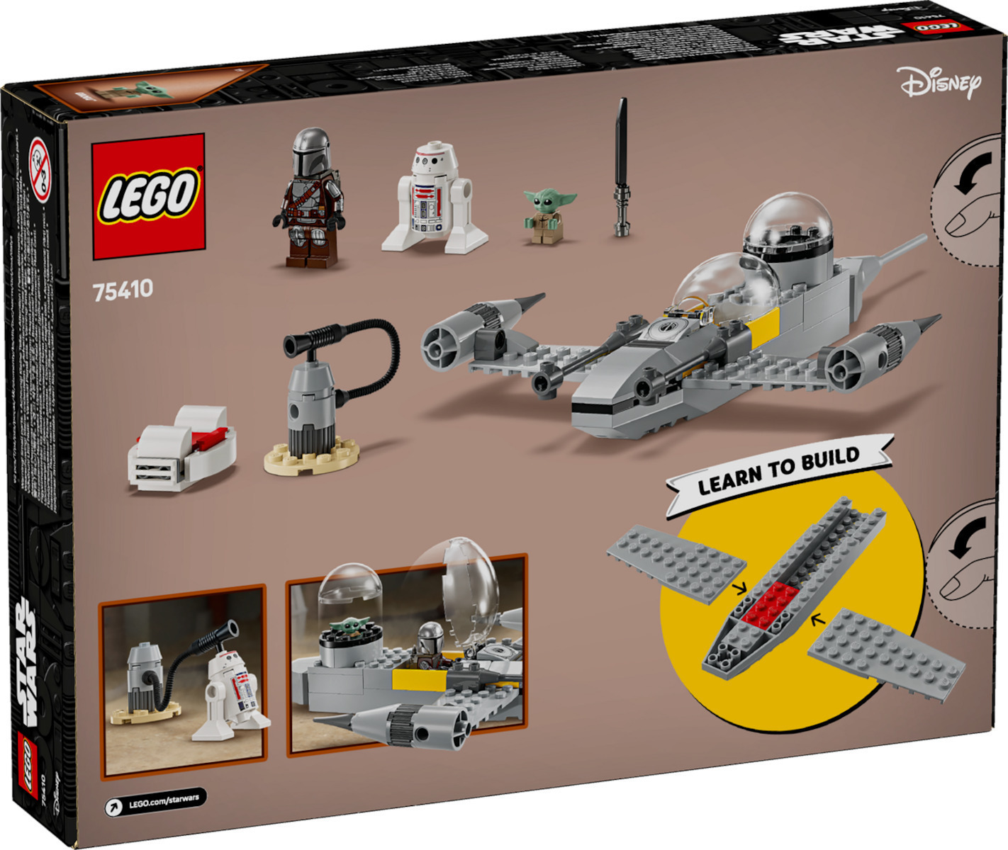 Αυτό το σετ μοντέλου N-1 Starfighter περιλαμβάνει 3 χαρακτήρες LEGO Star Wars: τον Mandalorian με darksaber και στοιχείο jetpack, τον Grogu με hover pram και τον R5-D4. Τοποθετήστε τον Mandalorian στην ανοιχτή καμπίνα του N-1 Starfighter και βάλτε τον Grogu στον χώρο επιβατών στο πίσω μέρος.