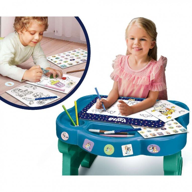 Ένα πλούσιο σετ για παιχνίδι και χρωματισμό με την Bluey και τους ωραίους φίλους της! Με πολλά υλικά για να διασκεδάσετε: έναν πίνακα γράψε σβήσε, βιβλία ζωγραφικής, έναν φάκελο, αυτοκόλλητα, χρώματα και πολλά άλλα! Το στιβαρό γραφείο με αποθηκευτικό χώρο είναι φιλικό προς τα παιδιά!