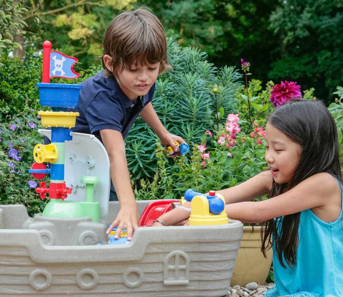 Πειρατικό καράβι με δραστηριότητες. Κεντρικό κατάρτι που λειτουργεί ως συντριβάνι, άγκυρα που ανεβοκατεβαίνει με μανιβέλα και κανόνι που σημαδεύει και ρίχνει νερό. Περιέχει 2 χαρακτήρες, σωστικό σκάφος, καρχαρία, σουρωτήρι, φτυαράκι και κουβά.