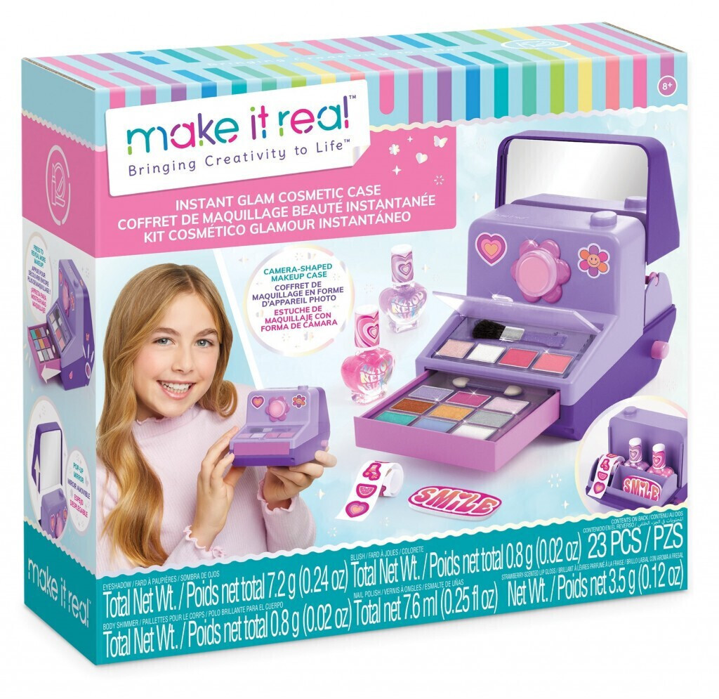 Το MAKE IT REAL - Instant Glam Cosmetic Set είναι το απόλυτο σετ ομορφιάς για παιδιά που λατρεύουν το στυλ και τη δημιουργική έκφραση. Σχεδιασμένο σαν φωτογραφική μηχανή, ανοίγει για να αποκαλύψει ένα πλήρες σετ μακιγιάζ για μάτια, χείλη και νύχια, μαζί με καθρέφτη, αξεσουάρ και διακοσμητικά αυτοκόλλητα.
