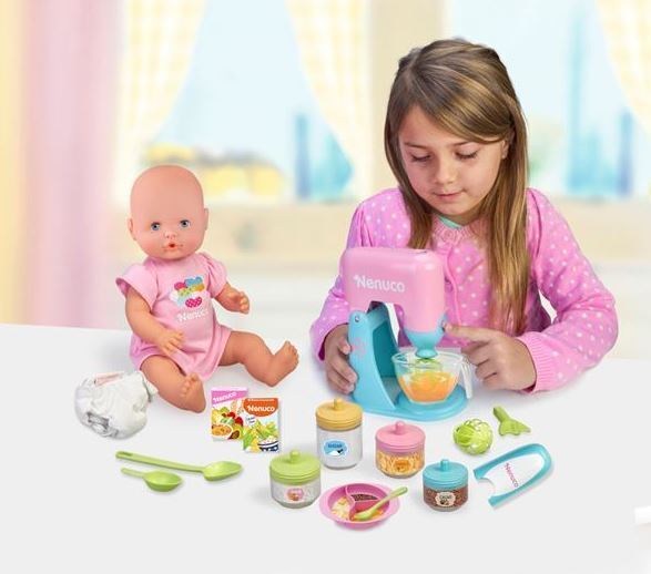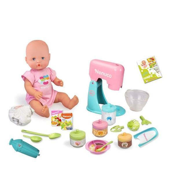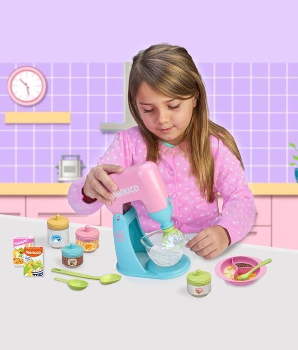Nenuco Born to be Loved! Ένα τρυφερό μωράκι που ζητά τη φροντίδα σου! Είναι ώρα για φαγητό Nenuco! Σετ παιχνιδιού με πολλά διαφορετικά αξεσουάρ προετοιμασίας φαγητού και κούκλα-μωρό ύψους 42 εκ. Προετοιμάστε το φαγητό της Nenuco με το μίξερ. Πατήστε το κουμπί, ανακατεύει στα αλήθεια το φαγητό για τη Nenuco. O αναδευτήρας αφαιρείται για να το χρησιμοποιήστε και ξεχωριστά σαν μιξεράκι χειρός. Βάλτε το φαγητό στο μπολάκι και ταίστε τη Nenuco με το κουταλάκι της -τρώει αληθινά! Μετά ώρα να της αλλαξετε την πάνα! Φυλάξτε τα φαγητά στα δοχεία της με καπάκι που περιέχονται. Περιέχει 15 αξεσουάρ. Απαιτούνται μπαταρίες (δεν περιέχονται).