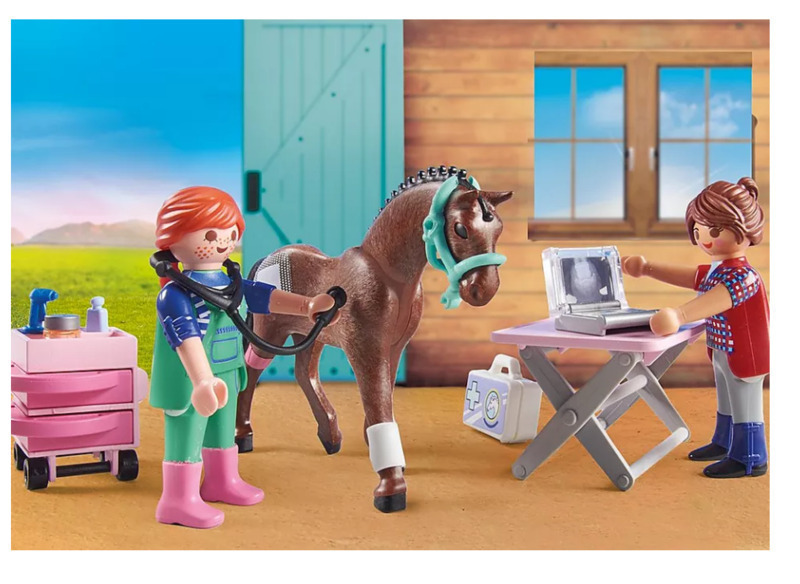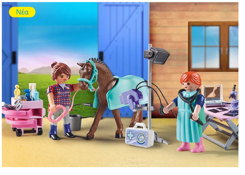 Επιπλέον πληροφορίες: Το σετ παιχνιδιού περιλαμβάνει δύο φιγούρες PLAYMOBIL, ένα άλογο, ένα ακτινογραφικό μηχάνημα, γραφείο με υπολογιστή, μικροσκόπιο και όλο 6τον απαραίτητο ιατροφαρμακευτικό εξοπλισμό για τη φροντίδα του αλόγου.