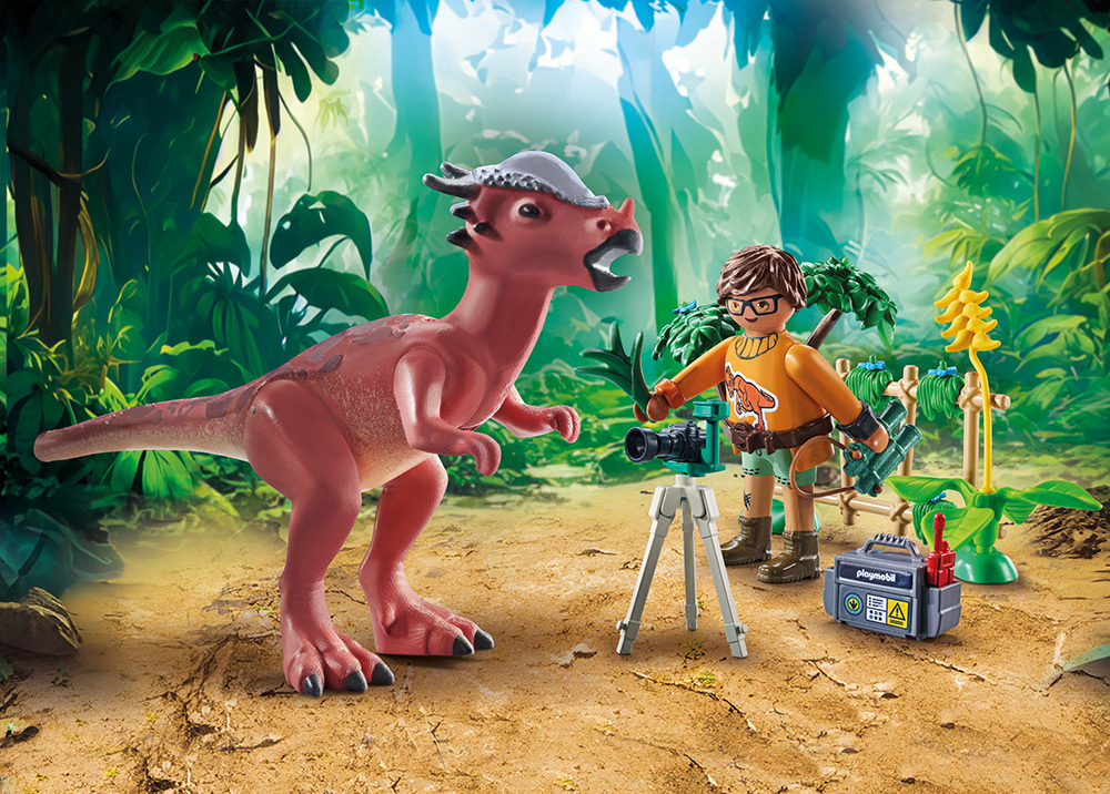 Ένας ερευνητής παρακολουθεί από ασφαλή απόσταση τον κόκκινο στιγυμόλοχο με το εντυπωσιακό κεφάλι του. Καταγράφει τις συναρπαστικές στιγμές με την κάμερά του, ανησυχώντας μήπως ο δεινόσαυρος τον δει και γκρεμίσει τον φράχτη. Ευτυχώς, έχει φέρει μερικά νόστιμα φυτά για να ταΐσει τον στιγυμόλοχο. Περιλαμβάνει κάρτα γνώσεων για δεινόσαυρους! Εξερευνήστε τη φύση με το σετ PLAYMOBIL Παλαιοντολόγος και Στυγιμολώχ! Ο πανίσχυρος Στυγιμολώχ μπορεί να κρατά φυτά με το στόμα του. Εξοπλισμένος με κιάλια, κάμερα και τρίποδο, ο ερευνητής καταγράφει συναρπαστικές στιγμές. Μάθετε συναρπαστικά γεγονότα για δεινοσαύρους με την κάρτα γνώσεων που περιλαμβάνεται. Φτιαγμένο κατά μέσο όρο από πάνω από 80% ανακυκλωμένα και βιολογικά υλικά, αυτό το σετ PLAYMOBIL προσφέρει ατελείωτη διασκέδαση για μελλοντικούς παλαιοντολόγους και λάτρεις της φύσης! Ηλικία: Από 4 ετών και άνω