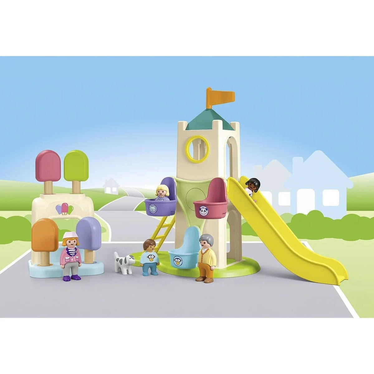 Περιλαμβάνει πέντε φιγούρες PLAYMOBIL JUNIOR, παιδική χαρά και τέσσερα χρωματιστά παγωτά.