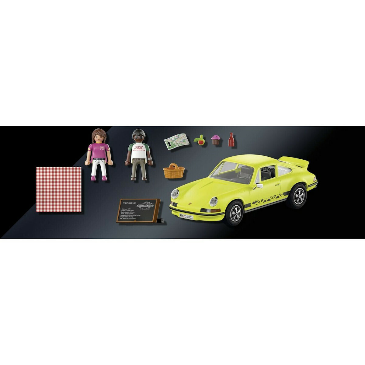 Το σετ παιχνιδιού αποτελείται από την Porsche 911 Carrera RS 2.7 σε κίτρινο χρώμα, δύο φιγούρες PLAYMOBIL, ένα καλάθι πικ νικ, μία κουβέρτα, έναν οδικό χάρτη και άλλα απίθανα αξεσουάρ.