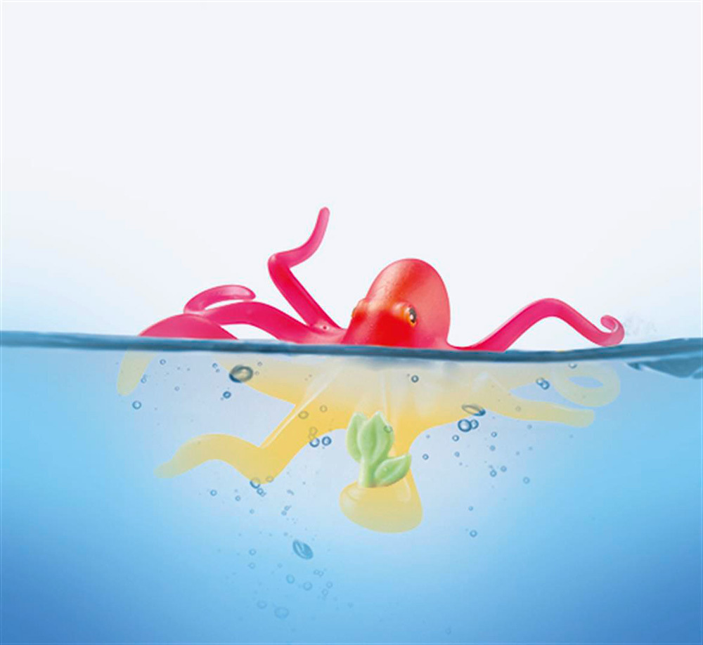 Η γοργόνα φροντίζει το χταπόδι και το ταΐζει με πεντανόστιμα φύλλα. Εάν τοποθετήσετε το χταπόδι μέσα σε ζεστό νερό, αλλάζει χρώμα. Με διακοσμητικό κοχύλι με βεντούζα.