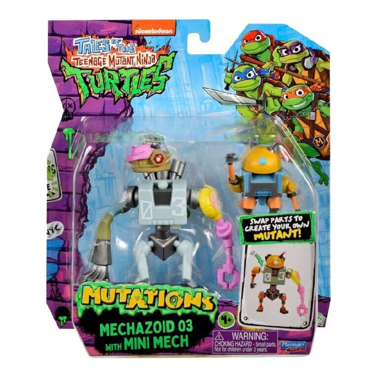 Φτιάξε το δικό σου μοναδικό Χελωνονιντζάκι! H νέα σειρά Tales of Teenage Mutant Ninja Turtles φέρνει τη δράση στα χέρια των παιδιών! Μετά τη νίκη τους ενάντια σε έναν Mega Mutant, τα Χελωνονιντζάκια γίνονται ήρωες του σχολείου, αλλά μια νέα απειλή από έναν αδίστακτο μηχανικό ρομποτικής τους αναγκάζει να ενώσουν ξανά τις δυνάμεις τους! Κάθε φιγούρα 12 cm είναι πιστή στο χαρακτήρα της σειράς και περιλαμβάνει επιπλέον 2 μέρη σώματος από διαφορετικούς ήρωες! Αντάλλαξε κεφάλια, χέρια, πόδια και δημιούργησε μοναδικούς custom mutants! Περιλαμβάνει τα αυθεντικά όπλα του κάθε χαρακτήρα για ατελείωτη δράση! 8 διαφορετικοί χαρακτήρες για συλλογή και αμέτρητους συνδυασμούς! Mechazoid, Lee the Eeel, Megamutant, Mustang Sally. Συνδύασε, άλλαξε και δημιούργησε τη δική σου, μοναδική ομάδα Χελώνων! Καθένα πωλείται ξεχωριστά. Για ηλικίες 4 ετών +