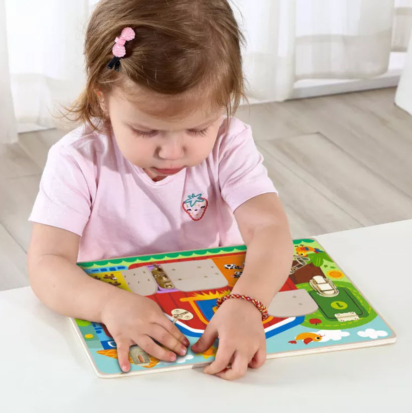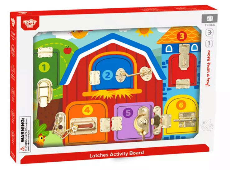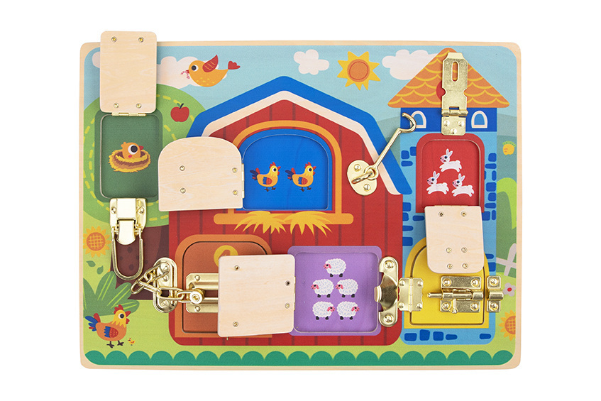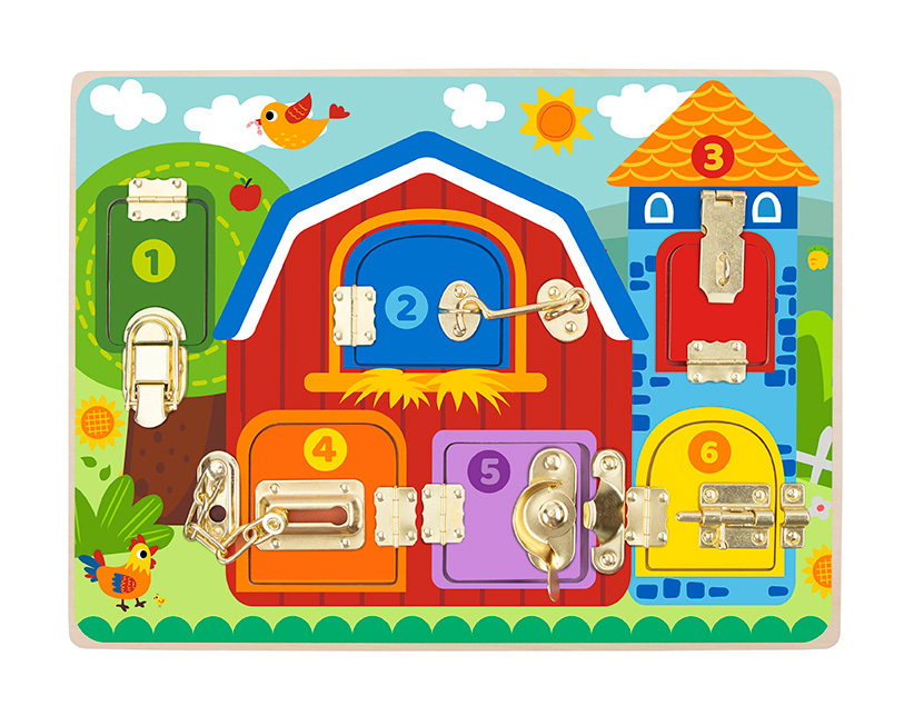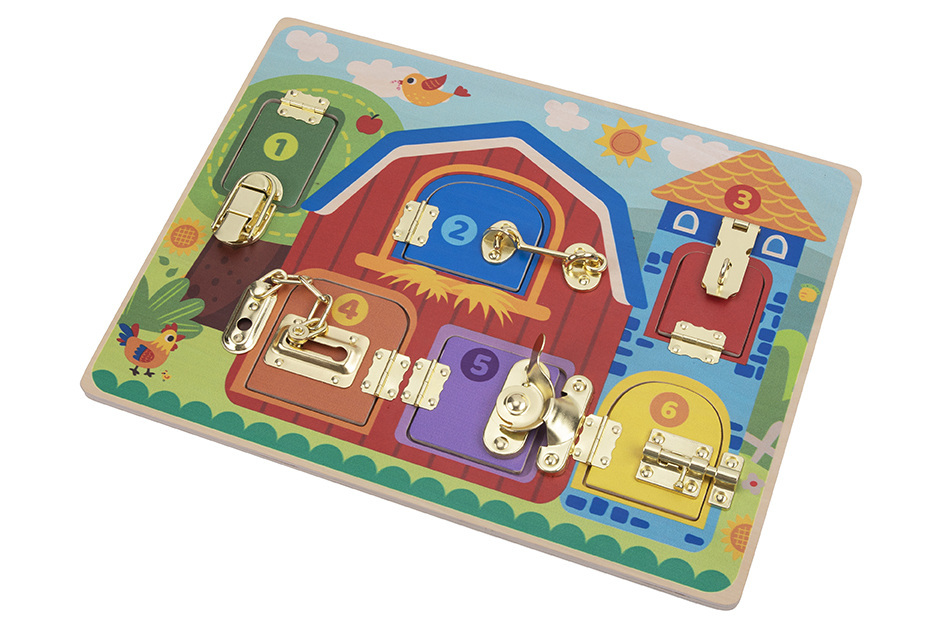 Ξύλινο εκπαιδευτικό παιχνίδι με κλειδαριές από την εταιρία Tooky Toy. Το σετ περιλαμβάνει 5 αρθρωτές πόρτες με αρίθμηση, οι οποίες κρατούνται κλειστές από διαφορετικούς τύπους κλειδαριών και μάνταλα. Ανοίγοντας κάθε πόρτα, αποκαλύπτεται μια εικόνα ενός ζώου. Κάθε πόρτα απαιτεί διαφορετική λεπτή κινητική ικανότητα για να ανοίξει.