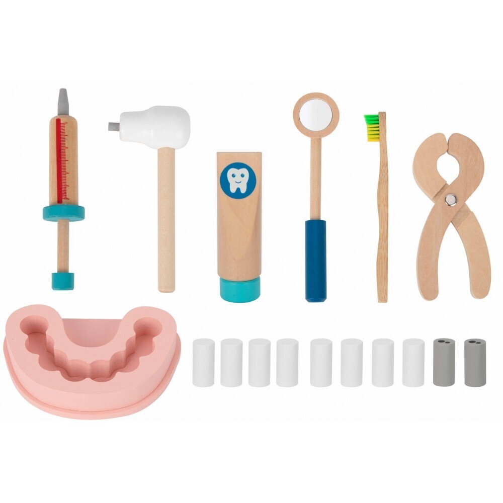 Σετ 19 τμχ. Διάφορα ρεαλιστικά οδοντιατρικά εργαλεία όπως καλούπια ούλων, τρυπάνια, λαβίδες εξαγωγής, οδοντιατρικοί καθρέφτες, σύριγγες, οδοντόβουρτσες, οδοντόκρεμα, 8 δόντια και 3 χαλασμένα δόντια