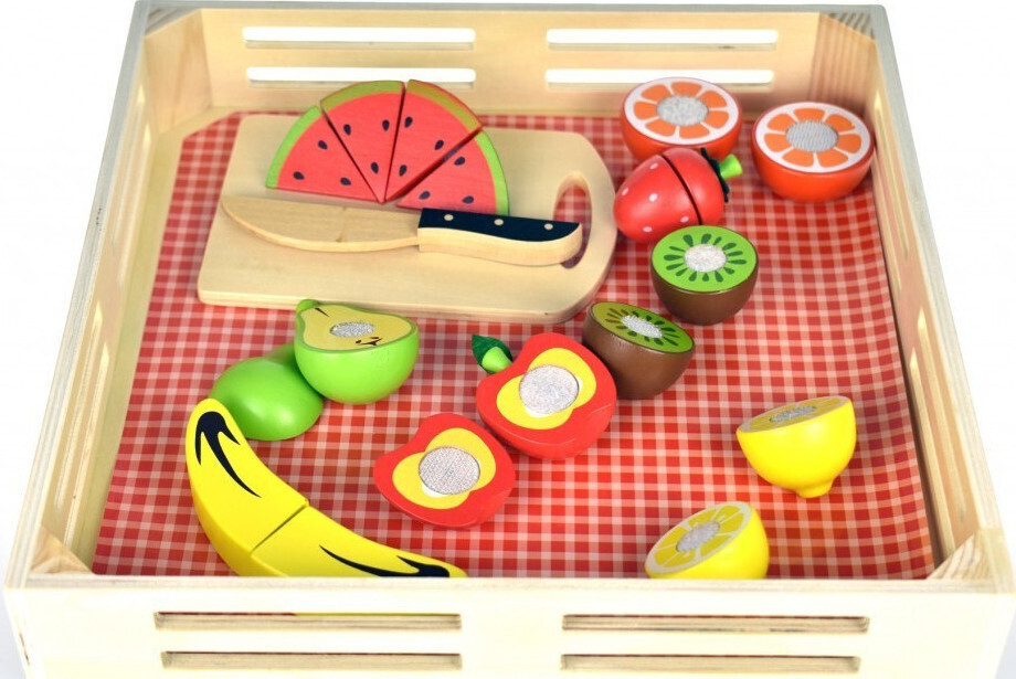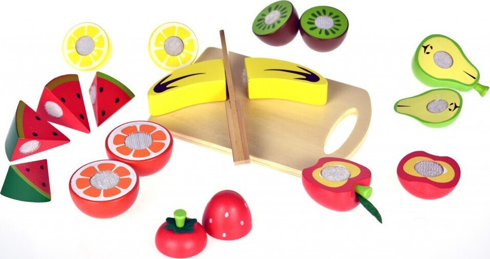 φρούτα , τα σχήματα και τα χρώματα και να αναπτύξει καλύτερο συντονισμό κινήσεων. Συμπεριλαμβάνεται και ξύλο κοπής και δίσκος για την τοποθέτηση των φρούτων. Διαστάσεις: 40 x 35 x 5 εκ.
